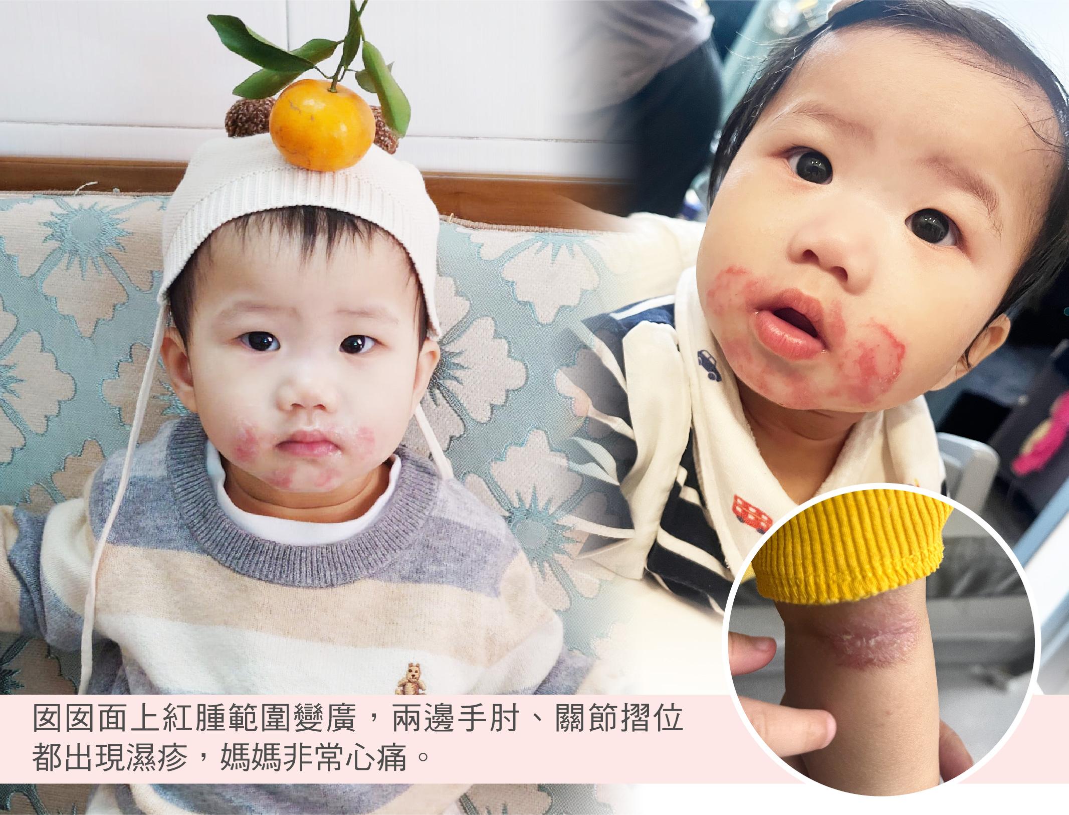 Candy 媽媽發現囡囡在半歲時,面部開始出現紅印,起初以為是輕微奶癬,但情況越來越嚴重,面上紅腫範圍變廣,兩邊手肘、大腿內側及關節摺位都出現濕疹。濕疹令Xanthe膚癢不停,Candy眼見到囡囡不斷搔抓,由初時變紅及乾燥到,後來形成一些小水泡,囡囡的粉嫩肌膚變成爛肉,甚至出血,決心為囡囡尋求解決方法。