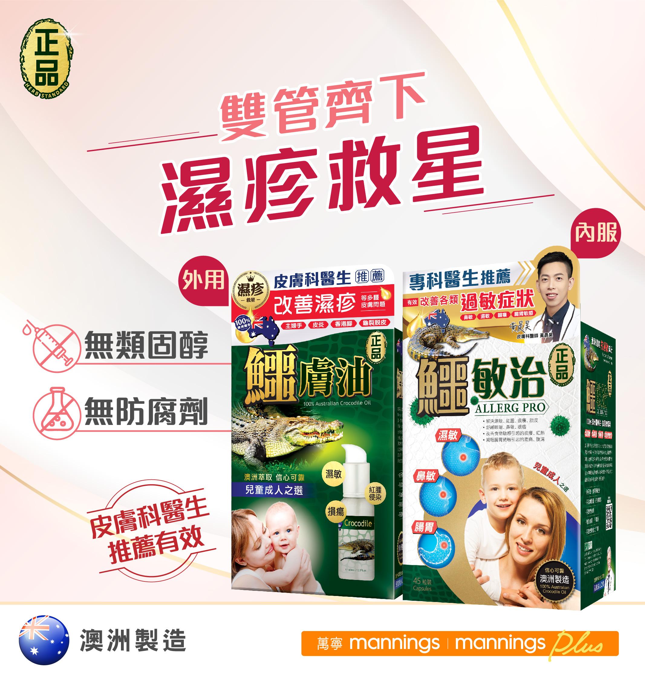 「正品鱷膚油」、「正品鱷敏治」蘊有 100%澳洲鱷魚油,現代生物學家研究指出,鱷魚體內的油脂具有強大的免疫力及癒合力,因此在污濁泥水內受傷,也絕少受到感染並會快速自癒,因而鱷魚油有「液態黃金」的美譽。想有效改善濕疹問題,記得到萬寧購買「正品鱷膚油」、「正品鱷敏治」,內服外用,濕疹救星。