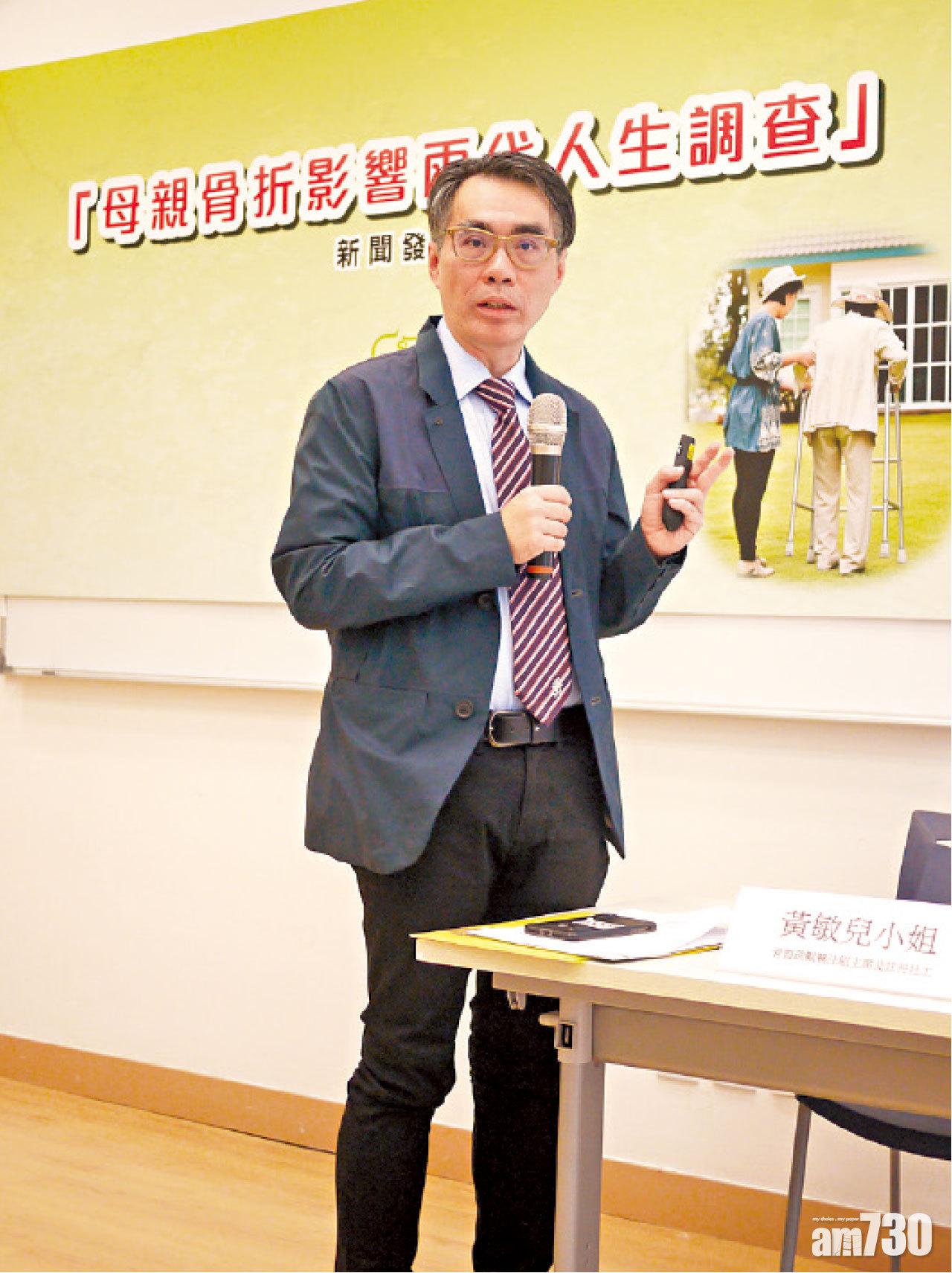 就骨質疏鬆對家庭帶來的影響,骨質疏鬆關注組主席、註冊社工黃敏兒表示,該組於3月作出「母親骨折影響兩代人生」調查,「從606位受訪女性中,發現接近三成受訪者的母親曾骨折或骨裂;而有57%母親會因為骨折而變得行動不便,需要用枴杖或坐輪椅;約有24%的女兒因要照顧母親而影響工作,甚至辭工。此外,調查亦發現年紀愈大,出現多次骨折的比率愈高,70至79歲組別更接近六成;當中髖骨骨折亦出現同樣情況,愈年邁比率愈高。」