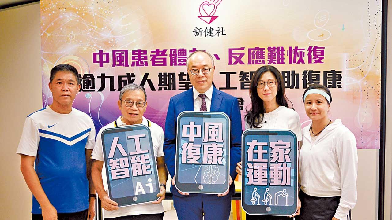 左起:中風患者蘇先生、新健社主席梁景航、腦神經科專科醫生黃家星、東華三院醫療及健康科學學院高級臨床講師黃潔怡及中風患者吳小姐。