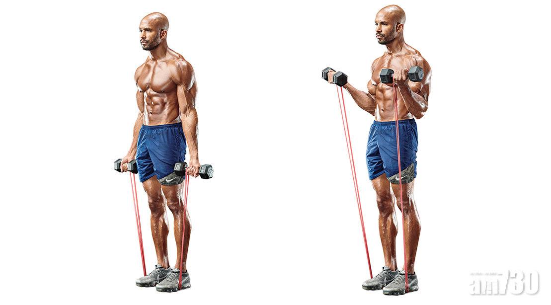 如果想以更完整的幅度訓練二頭肌,可以加一條阻力帶,讓動作後半部可保持對抗的力量。女士亦可只用阻力帶去取代啞鈴。
