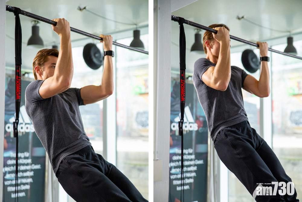 - 與訓練背肌的Chin-Up不同,身體慢慢放下只至手臂屈90度位置,然後再將身體拉上,重複動作。目的是減少背肌的參與,集中於二頭肌訓練。拉上身體時呼氣,放下時吸氣。每組做6次,做2至3組。