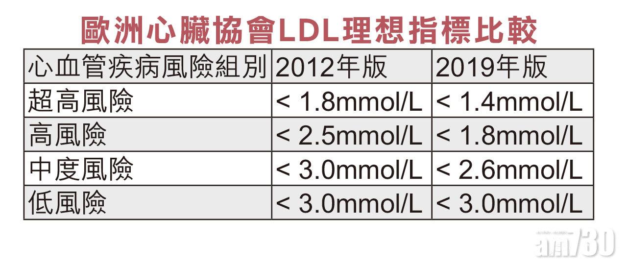 早前歐洲心臟協會(ESC)發布2019年血脂管理指南,進一步收緊本已嚴格的低密度脂蛋白(LDL,俗稱壞膽固醇)理想指標。相較2012年,在可患上致命冠心病的4個風險組別當中,壞膽固醇標準數字減幅達三至八成不等。指南更特別提到,超高危群組的患者,原本要求是低於1.4mmol/L,但如在近兩年內曾患兩次或以上的急性血管疾病(如心肌梗塞或缺血性中風),最好將水平降至少於1.0mmol/L。