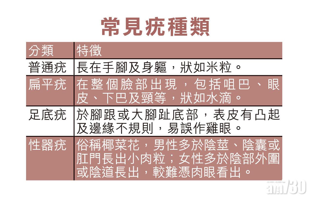 疣是由人類乳頭瘤病毒(HPV)感染而引起,但不一定因性接觸所致。英國皇家全科醫學院院士蘇勇柏醫生解釋,此病毒常存在於衛生欠佳的環境,如辦公室的電腦、美容院等;或是共用私人物品如化妝品、拖鞋或手套等,也有機會感染。而根據不同特徵,疣可分為普通疣、扁平疣、足底疣和性器疣(見附表)。