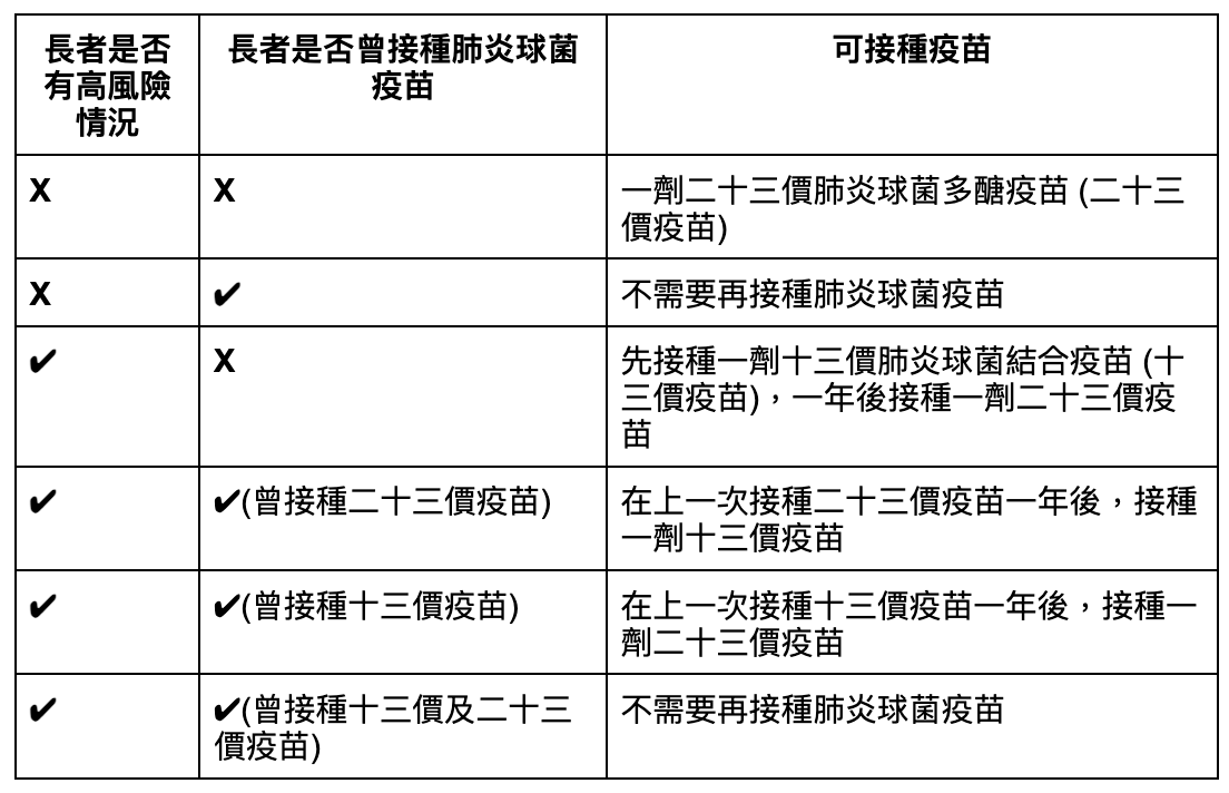 年滿65及以上的長者,同時有高風險情況,包括曾患侵入性肺炎球菌病、缺乏免疫功能、慢性疾病、裝有人工耳蝸之人士,亦應接種一劑十三價疫苗,一年後再接種一劑二十三價疫苗。每針應相隔一年時間。患上肺炎球菌病的風險及病情因人而異,視乎年齡及健康狀況。有高風險情況的人士應向醫生查詢及商討,選擇最合適的肺炎球菌接種方案。