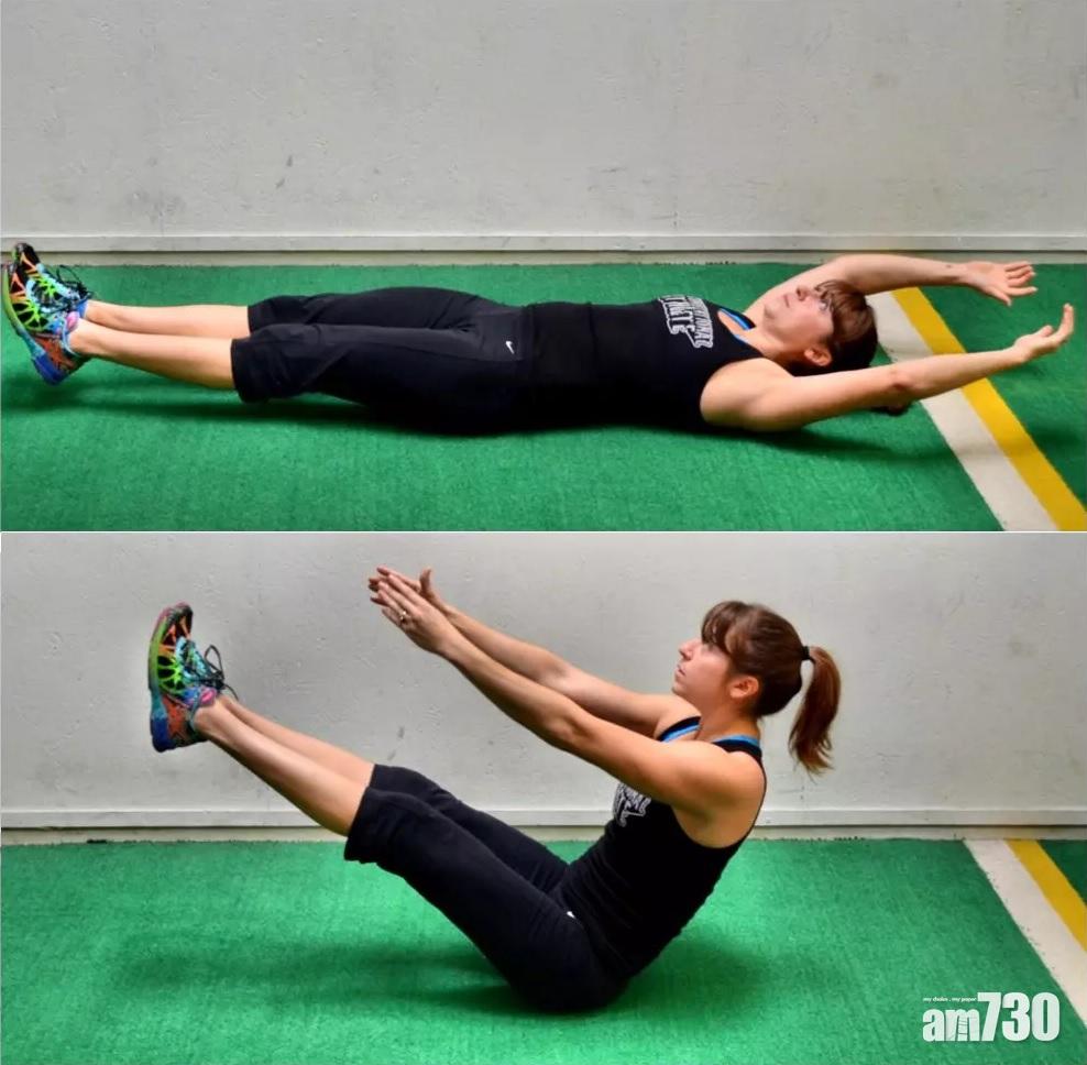 - 腹肌發力同時帶起上半身和腿,手嘗試觸摸腳尖,並於此位置停頓1秒。
