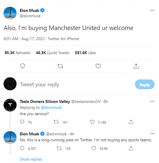 近年愈來愈難以捉摸的Elon Musk,終於在5小時後回答「認真嗎?」的提問,「不,這是在Twitter上一個長久以來的笑話。我無意收購任何體育隊伍」(No, this is a long-running joke on Twitter. I'm not buying any sports teams),令不少曼聯球迷大失所望。