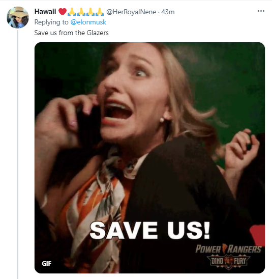 有曼聯球迷發文呼籲Elon Musk「救救我們」。(互聯網)