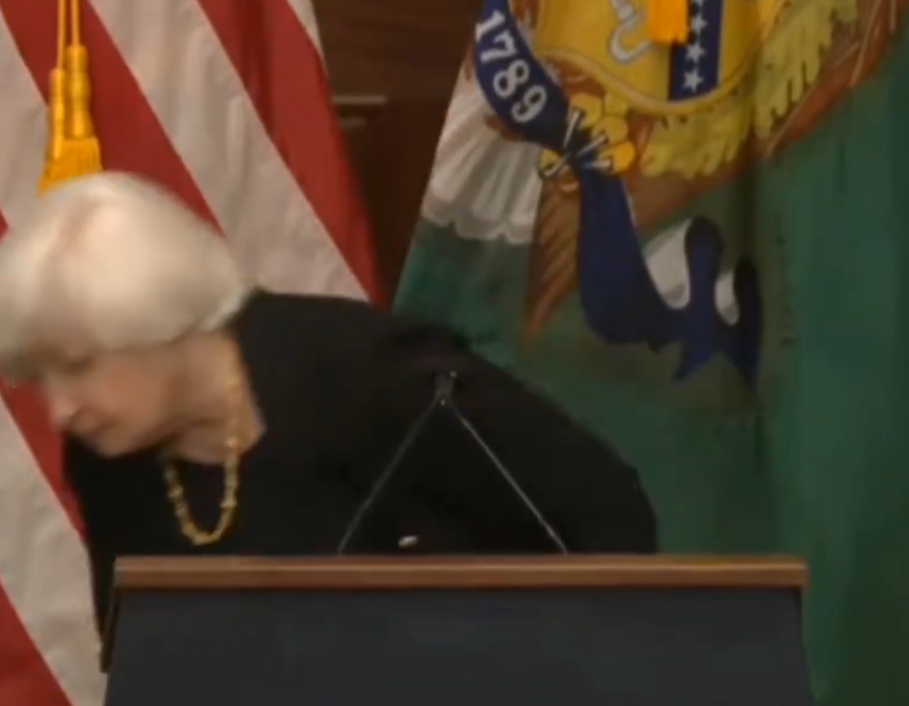 國際貨幣基金組織和世界銀行年日前在美國華盛頓召開之際,美國財長耶倫上周二(22日)在一場記者會發表講話的一幕,近日在網上瘋傳。