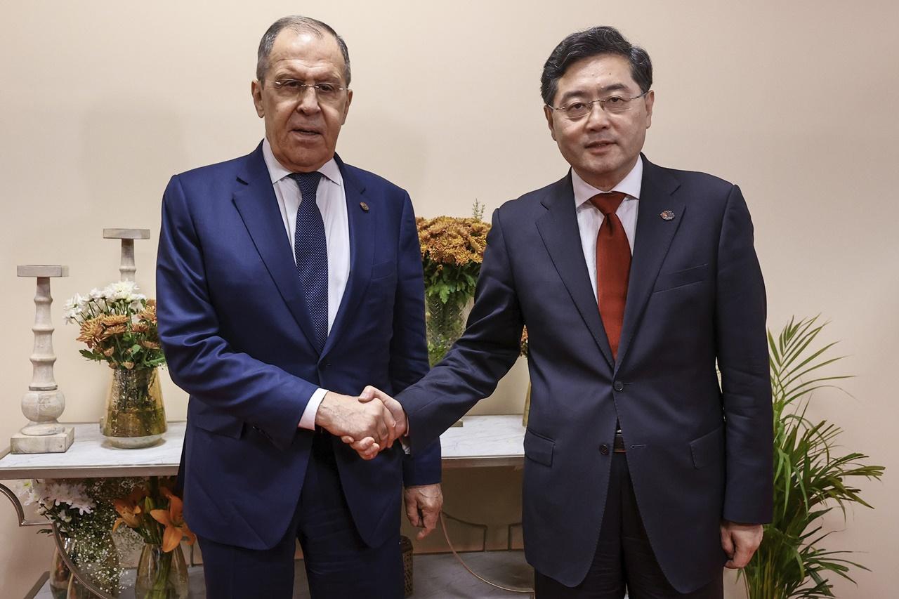 外長秦剛在印度新德里出席二十國集團(G20)外長會議期間,與俄羅斯外長拉夫羅夫(Sergey Lavrov)會面,談及雙邊關係和烏克蘭危機等問題,並簽署2023年兩國外交部磋商計劃。秦剛重申,中方在烏克蘭問題上,支持政治解決危機,反對拱火澆油,反對破壞和談,反對雙重標準,反對制裁施壓。