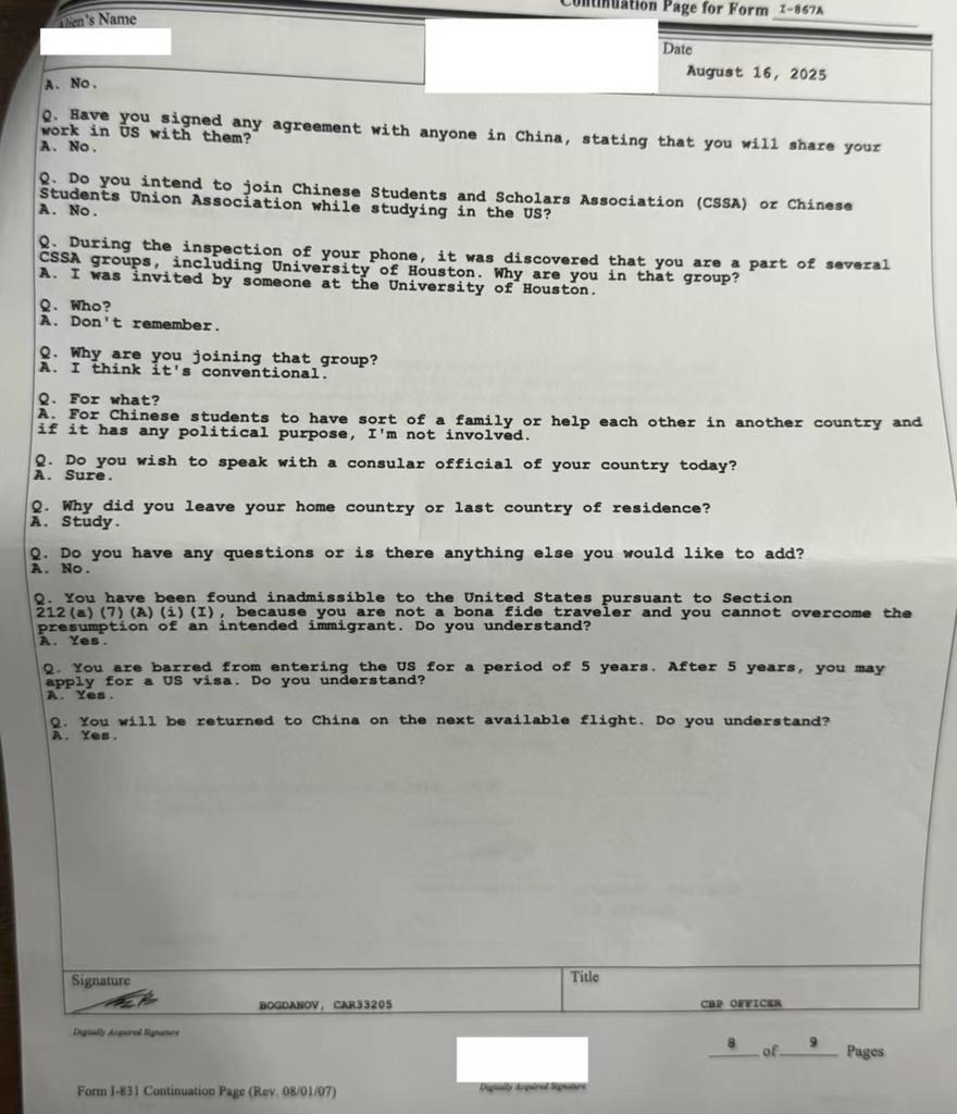 美媒報道,一名中國留學生今年8月中旬持有效簽證赴美升學,但入境時遭海關連續3輪、長達10小時查問後被遣返,並且5年內禁止入境。該名學生計劃修讀哲學,並非AI等敏感領域,遣返通知上標註「文件不全」。