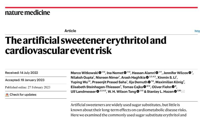 美國一項研究顯示,零卡路里代糖「赤藻糖醇」(或稱赤蘚醇, erythritol)與血栓塞、心臟病發、中風,甚至死亡有關。研究由Cleveland Clinic Lerner Research Institute的心血管診斷及預防中心進行,領導研究的中心主任Stanley Hazen稱,赤藻糖醇導致上述疾病的「風險並不輕」。周一刊登在《自然醫學》(Nature Medicine)期刊的報告指,有心臟病致病因素例如糖尿病的人,血液中赤藻糖醇水平最高的25%人士,與最低的25%人士相比,心臟病發或中風機會是低水平人士的兩倍。實驗室和動物研究發現赤藻糖醇似乎導致血小板更容易凝結成塊,血凝塊可到心臟引致心臟病發,或到腦部引發中風。沒有參與研究的專家認為,有關研究結果敲響警號,需要做更多研究,同時也應減少攝取赤藻糖醇。