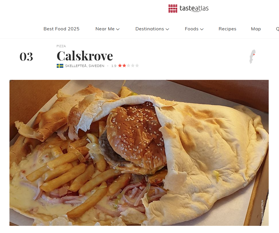 全球百大難吃食物頭兩位都是跟「血」有關,分別是瑞典的「血煎餅」(Blodplättar)及芬蘭的「血餃子」(Blodpalt),5分最高分它們分別獲得1.6及1.8分,相信不少人未吃但聽到「血」字已怕怕。至於第3的則是瑞典的「薄餅餃」(Calskrove),其把漢堡包及薯條等塞入薄餅片內包住再焗,據報是一間餐廳創作,讓不知點薄餅還是漢堡包的顧客,一個「唔駛用腦」的選項,獲得1.9分的超低分。