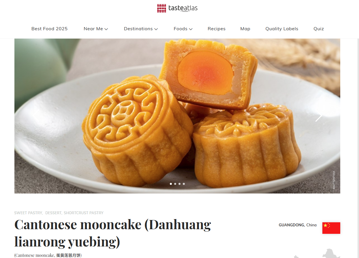 令不少人詫異的是,港人愛吃的蛋黃蓮蓉月餅(廣式月餅),竟登上第25位。網站指蛋黃蓮蓉月餅是不少亞洲地區民眾中秋節時會吃的應節食物,有團圓意頭,並指用蓮子做成的餡又甜又滑,加上象徵月亮的蛋黃。不過投票者卻不受落,令蛋黃蓮蓉月餅只得2.7分。除了位列全球第25難食外,蛋黃蓮蓉月餅亦名列「最難吃烘焙」(#1 Worst Rated Pastry in the world)、「最難吃中菜」(#1 Worst Rated Chinese dish)、「最難吃中式甜品」(#1 Worst Chinese Dessert)及「最難吃中式烘焙」(#1 Worst Rated Chinest Pastry),並位列「全球第2難吃甜品」(#2 Worst Rated Dessert in the world)。