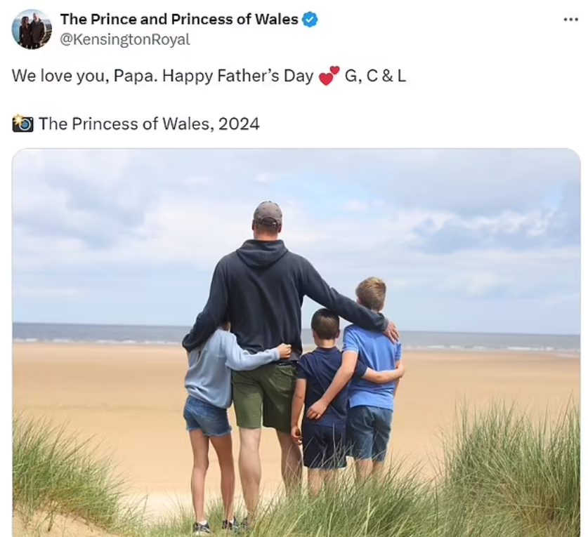 照片是復活節時威廉一家到諾福克郡一個海灘時拍下,可見威廉張開雙臂,搭在10歲大仔喬治王子及9歲二女夏洛特公主的肩膀,6歲細仔路易王子則站在父親及哥哥之間,輕擁著哥哥的腰。眾人一起靜靜地望海,凱特則站在他們身後,拍下此動人時光。3名子女趁照片發布寫下訊息,說「我們愛你,爸爸。父親節快樂。G、C和L上」。G、C、L分別是他們3人名字的頭一個字母。英媒指,今次是3位小王子及小公主第一次「發聲」。