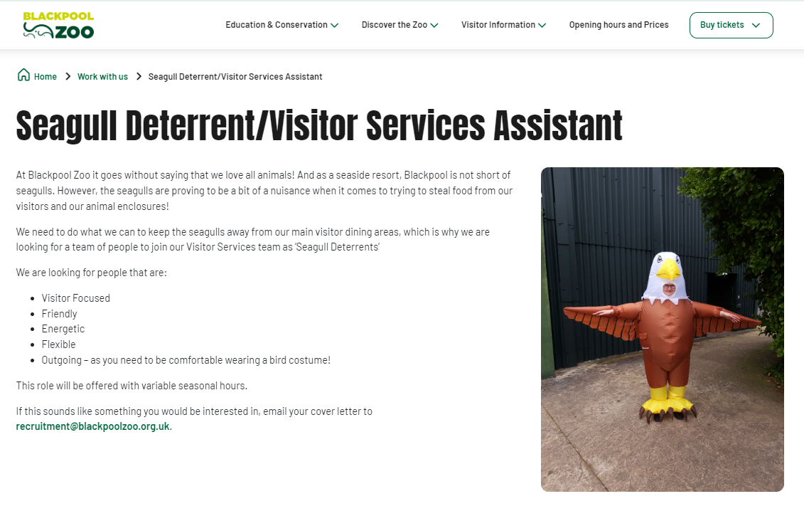 原來動物園位處海邊城鎮,除了遊人外,出現得最多的是——海鷗——其數量多之餘,又不時在遊客及園內動物住處內,盜走食物,令園方不勝煩擾。園方因此成立了一支「海鷗震懾隊」(Seagull Deterrents),以真人扮成大鳥「以鳥制鳥」,嚇走海鷗。園方強調最主要的是想「讓海鷗遠離訪客主要的用餐範圍」,並要求應徵者要外向、專注力高、友善、有活力及懂得變通,而工作時段將視乎季節而定。
