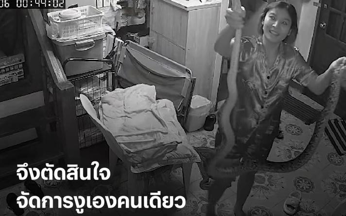 根據泰媒《Thairath》報道,這名年輕的女飼主凌晨被貓咪的叫聲驚醒後,原本以為愛貓可能跟常來家裡睡覺的流浪小貓在玩鬧,走到貓咪平常愛待的地方,卻見放在這裡的洗衣籃掉在地上,當她抬起頭,整個人都嚇傻了,架子上有條大蟒蛇正纏著其中一隻貓咪。為了不讓其他貓咪受傷,她趕緊拿起手電筒開始找蛇頭在哪裡,看準時機,待蟒蛇稍微鬆開纏繞貓咪的身體,就一手抓住蛇的頸部,成功制伏這條大蛇,她隨即亮起家裡的燈,把手中約長2米的蟒蛇在CCTV鏡頭前炫耀一番。