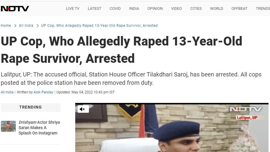 印度北方邦一名13歲女童遭4名男子輪姦後,到警署報案,再遭警員強姦,涉事警員已被拘捕,另外,拘捕3名涉嫌輪姦女童的男子,另有1人在逃。