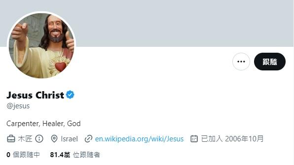 有戲稱自己是「耶穌基督」的帳號都獲認證,更聲稱自己在Twitter已14年,感謝馬斯克讓他獲得認證。(Twitter)