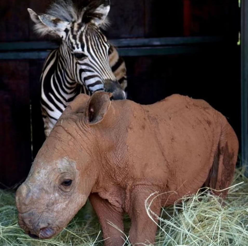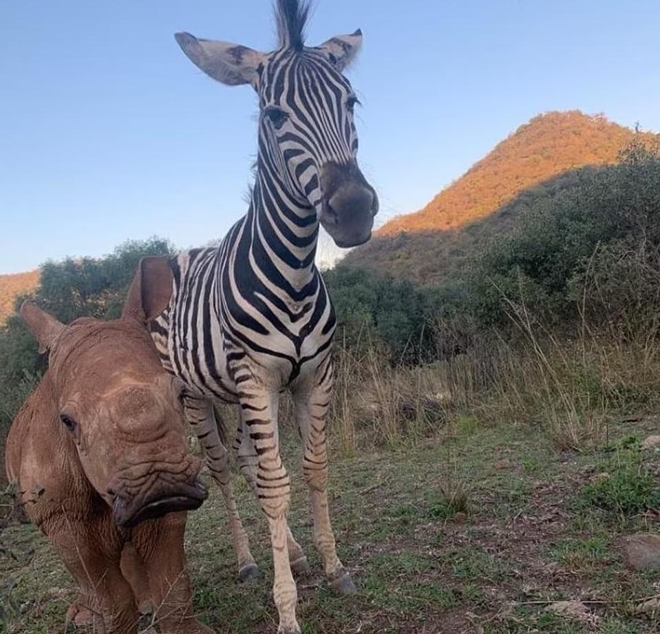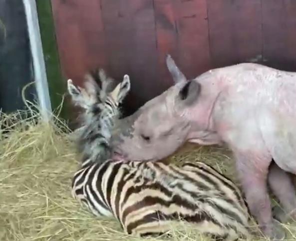 7個月大的犀牛「Daisy」與比牠大一個月的斑馬「Modjadji」,在野生動物庇護中心接受治療期間形影不離,從中心在Instagram發布的影片可見,牠們一同喝奶、散步,睡覺時依偎在一起,Daisy會像狗一樣,舔舔Modjadji背部,十分親暱。