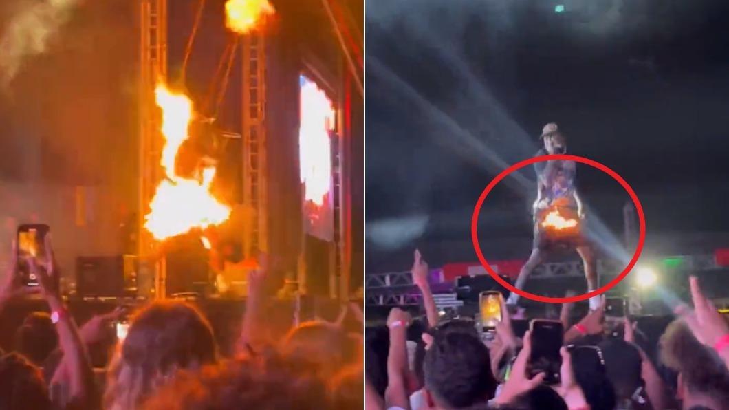 饒舌歌手瓊加表演期間被火柱擊中。(圖/翻攝自X@FOFOQUEl)