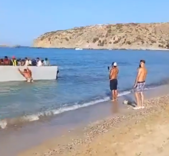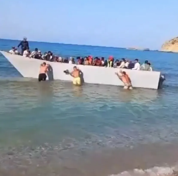 英國早前爆發大規模的非法反移民示威,歐洲多國同樣深受非法移民問題困擾,其中一段攝於本月13日的片段顯示,希臘南部加夫多斯島(Gavdos)的薩拉基尼科海灘(Sarakiniko)上,有泳客跳入海中,想徒手推離一艘載滿非法移民的小船,阻止其靠岸。據報該船載著來自利比亞的人蛇,他們試圖登陸時,被泳客高聲喝止,並欲將其引導至港口方向。