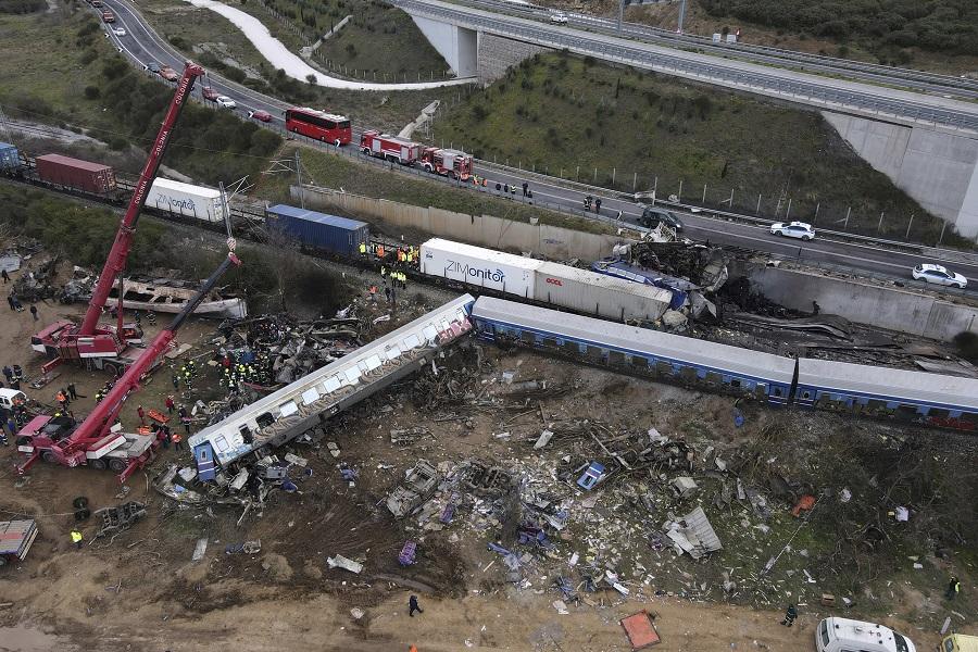 希臘周二深夜發生火車相撞事故,搜救人員周三早上仍在火車殘骸內搜索。(美聯社)