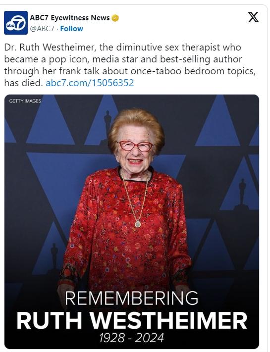 「性學大師」露絲‧韋斯特海默(Ruth Westheimer)於7月12日離世,享耆壽96歲。(圖/翻攝X)