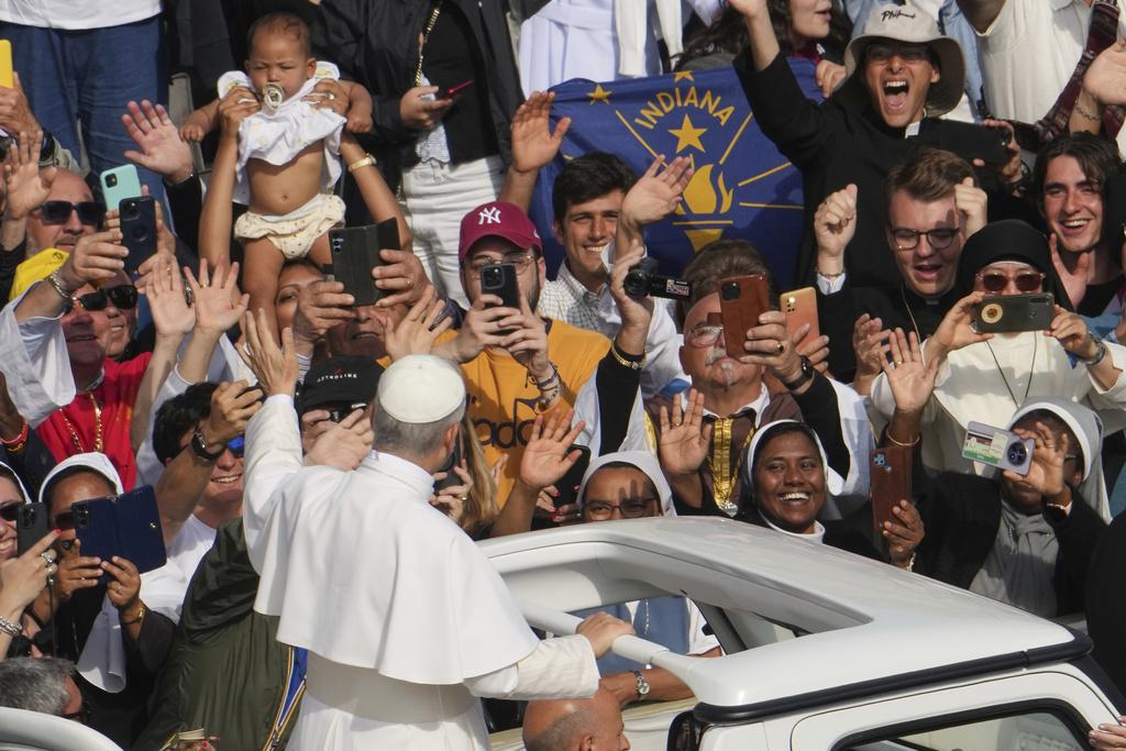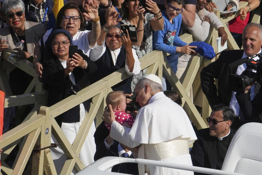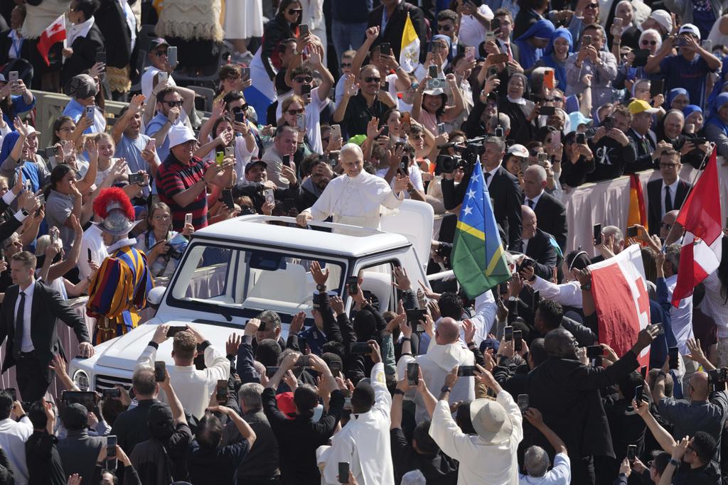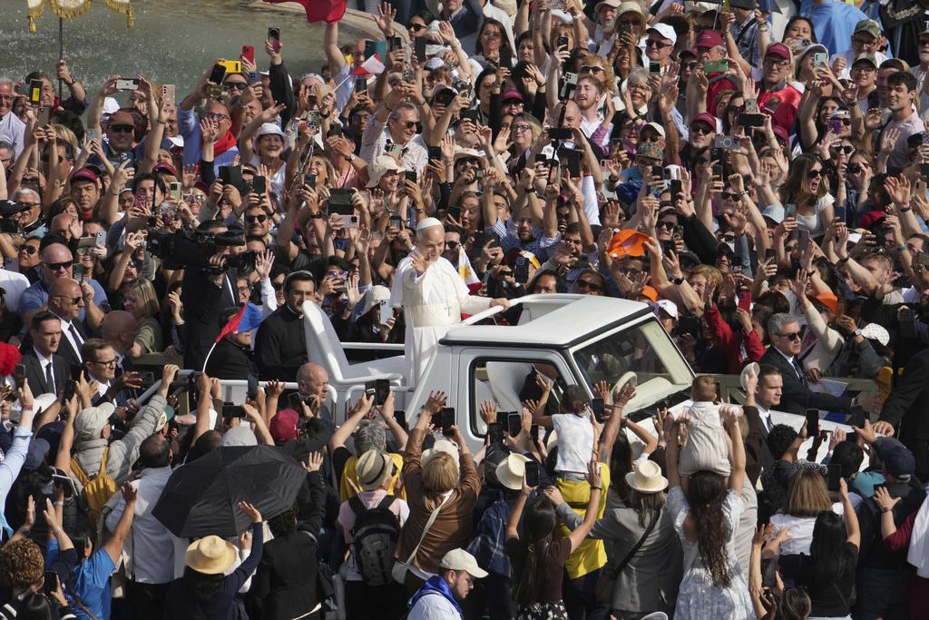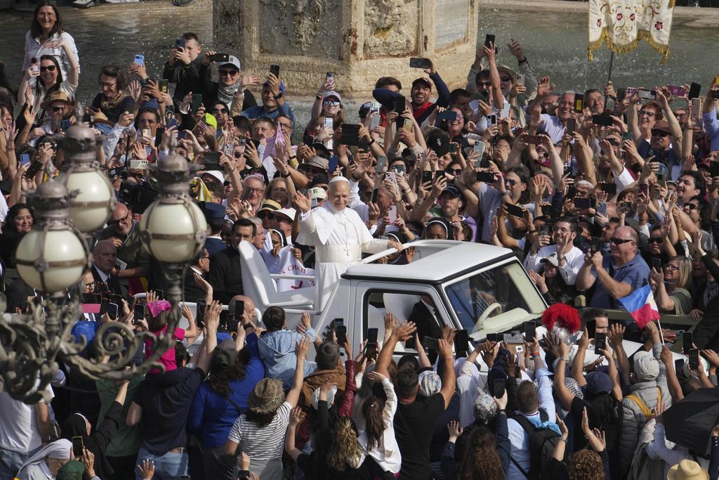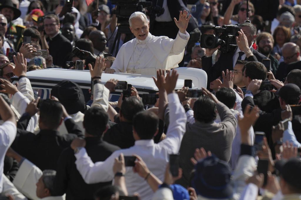 69歲的教宗乘坐專用的開篷座駕,在聖伯多祿廣場繞行,他站在開篷車的後座,向廣場上的信眾揮手。由於教宗除擁有美籍外,亦擁有秘魯國籍,故現場除可見美國及梵蒂岡國旗外,也可見不少秘魯國旗,民眾也紛為教宗歡呼。