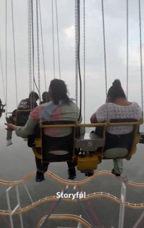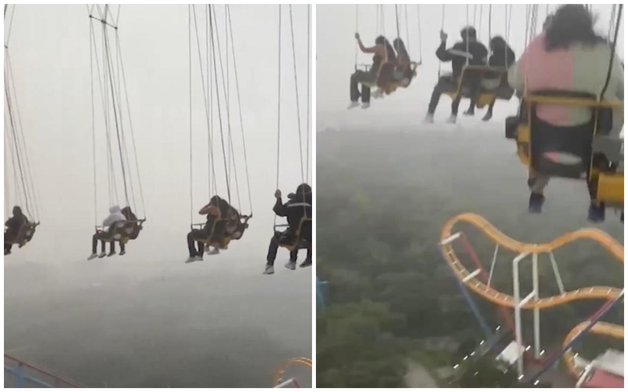Momento horrível em que visitantes de um parque ficaram pendurados a 200 pés no ar em um brinquedo com mau tempo.