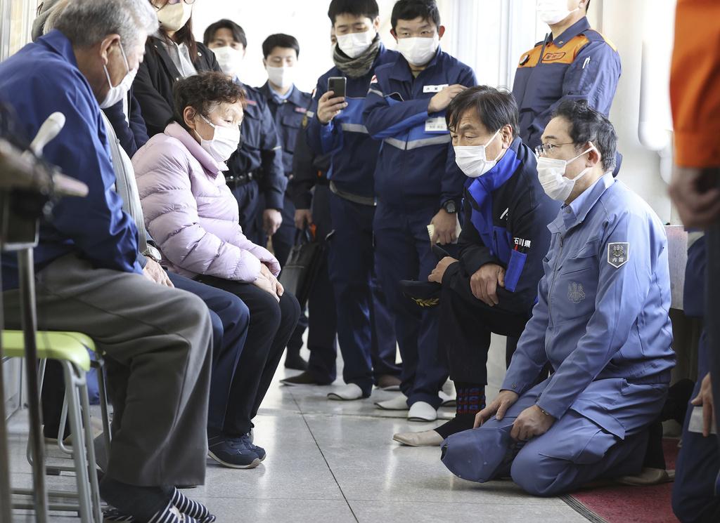 岸田文雄聽珠洲避難所災民講述情況。(美聯社)