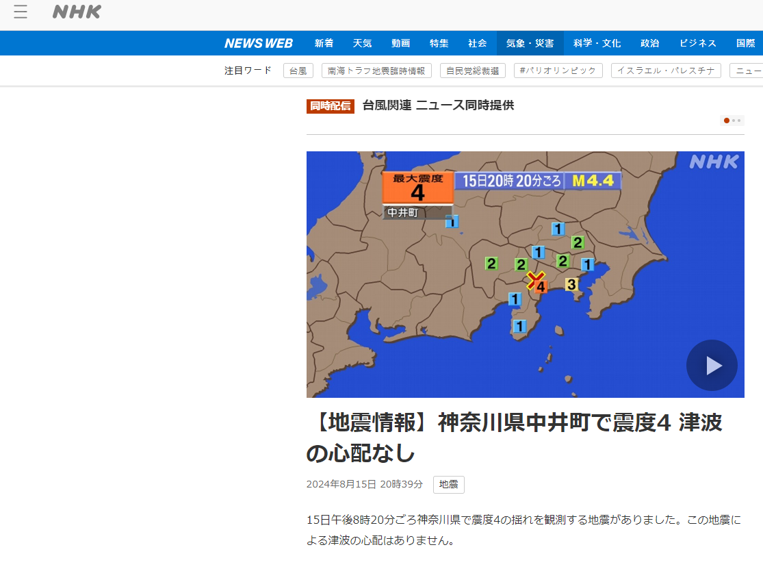 日本於香港時間今日午4時剛解除「南海海槽地震臨時情報」(巨大地震注意)警報,神奈川縣於晚上約8時20分發生黎克特制4.4級地震,震源深度10公里,屬淺層地震。截至本港時間晚上未傳傷亡及損毀報告,當局亦沒有發出海嘯警報。