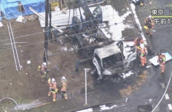 東京都江戶川區一處工地周二早上爆炸,有工程車起火焚燒。(互聯網)