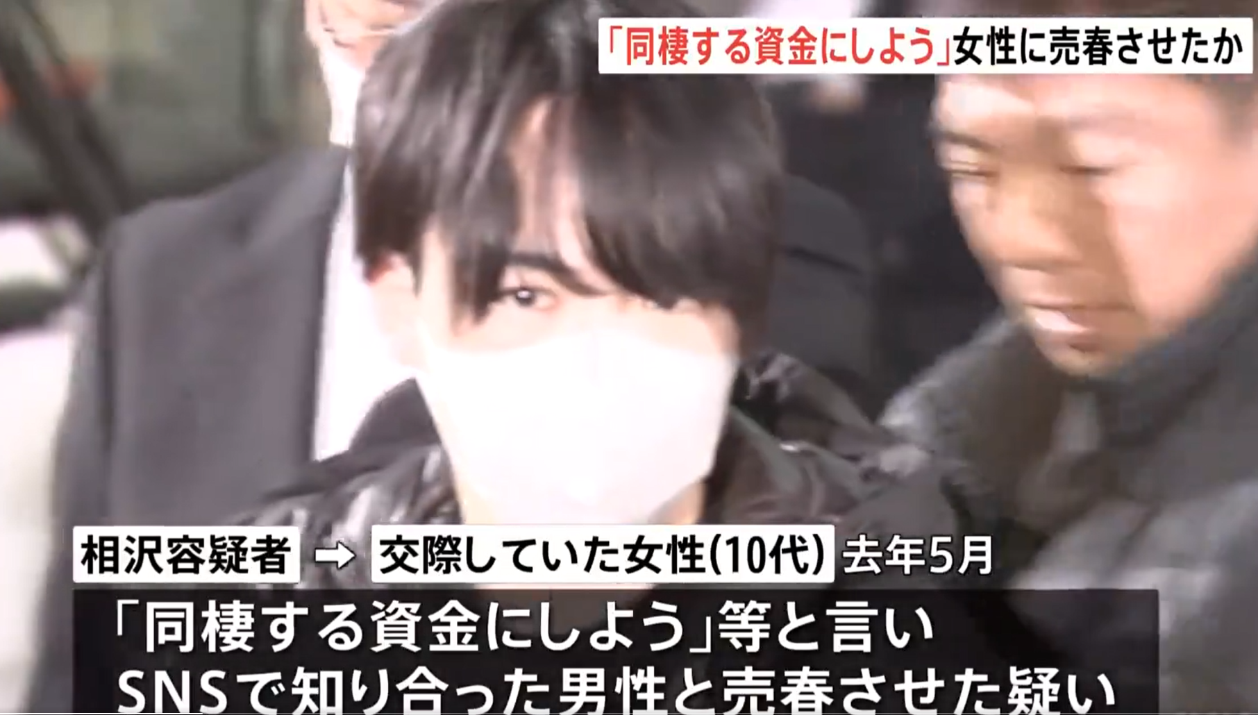 日本一名25歲男子相澤龍誠,被指欺騙一名10多歲的少女,指示少女賣淫過百次,並以「同居基金」名義,收取女子賣淫獲得的款項,超過1,000萬日圓(約53.8萬港元),然而他之後與另外女性結婚而被捕。