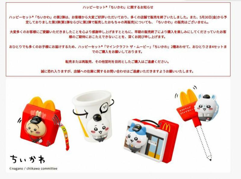 日本麥當勞今日在官方網站公布,會取消原定下周五舉行的第3波活動。麥當勞解釋從本月23日開始的Chiikawa第2波活動大受好評,許多門市都銷售一空。而第3波活動原本是要重新販售第1、2波的玩具,受此影響已無庫存可賣。麥當勞指兒童餐會改為附送Minecraft聯名、繪本、圖鑑等玩具,對於無法讓顧客滿意深感抱歉,也呼籲民眾勿向各餐廳打聽是否還有Chiikawa玩具。