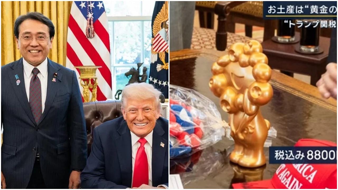 照片同時拍到在特朗普的辦公桌上,擺放著赤澤亮正致贈的大阪關西世博會吉祥物「脈脈」的金色「錢罌」。據日本媒體報道,錢罌是中國製造,售價為8,800日圓,約合480港元。
