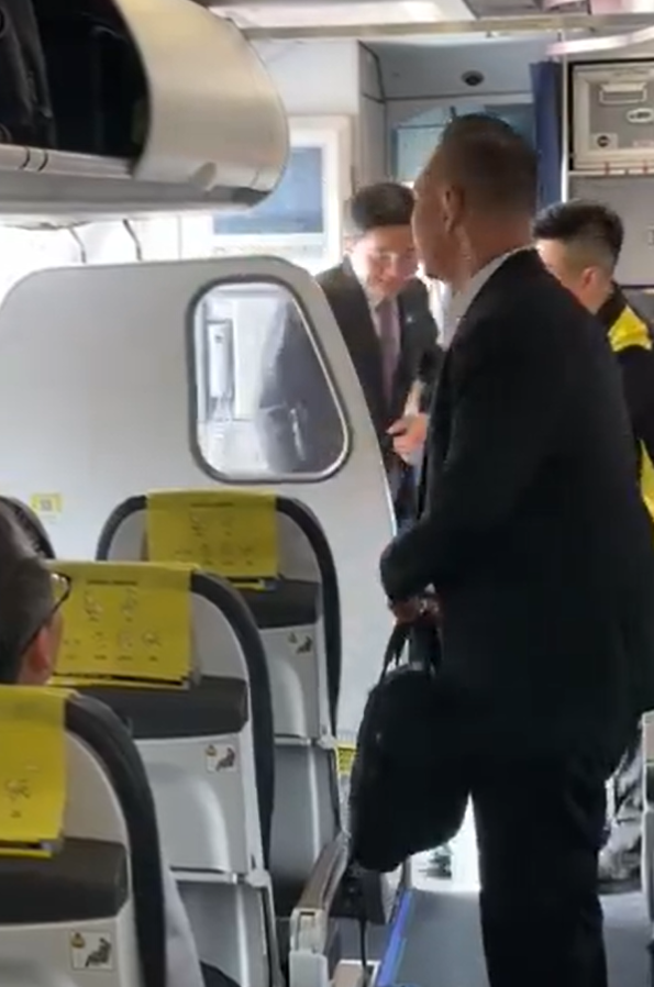 黃循財乘廉航被「捕獲」(左),機上民眾熱烈鼓掌歡迎。(互聯網)