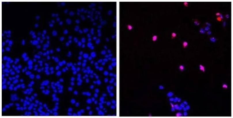 使用AOH1996前(左)和使用後(右)的癌細胞群分別,紫色是被正在死亡的癌細胞。(希望之城醫療中心)