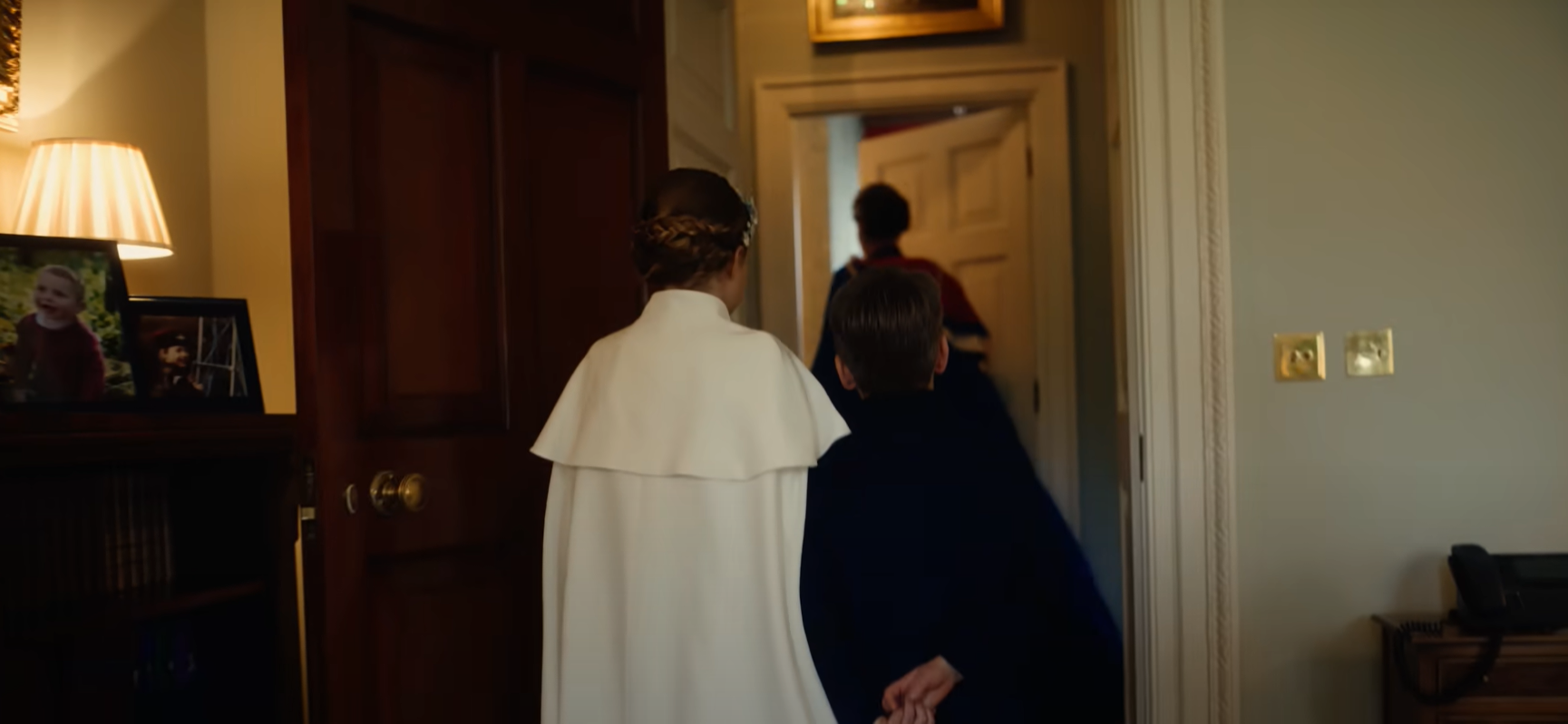 片段最惹關注的,是威廉一家在肯辛頓宮準備出門的一幕,可見整裝待發的兩位小公主小王子、威廉及凱特先後步入房內。英媒隨即將之定鏡研究,指威廉所住的肯辛頓宮1A單位,由地庫至閣樓共有20間房,片段拍到的是其中一間,可見房內櫃子上擺放了夏洛特4歲時的官方生日照、路易1歲時的官方生日照,以及威廉夫婦大婚當日所攝的凱特夫母照片。牆上則掛有英國維多利亞女王姨母、薩克森科堡薩爾費爾德的朱麗安妮公主畫像。