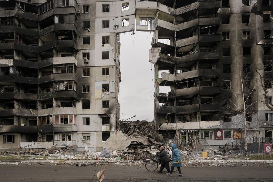在博羅江卡,一座住宅大廈遭炸穿一個大洞,如被劏開。(美聯社)