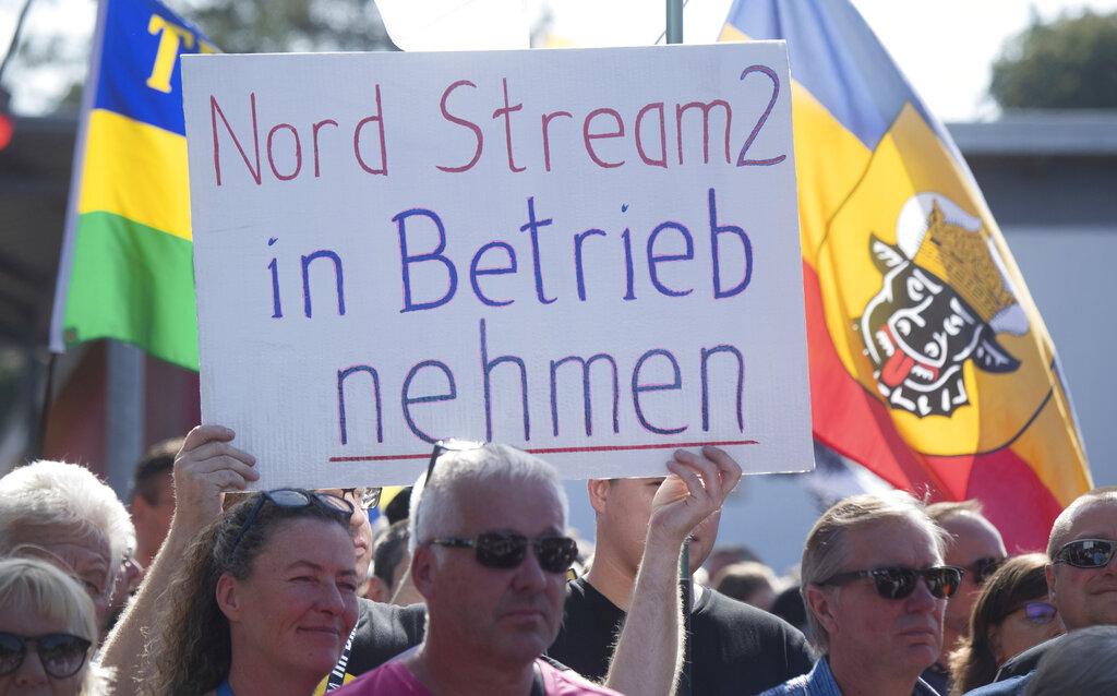 德國民眾周日上街示威,抗議俄羅斯關閉供歐天然氣管道。(美聯社)