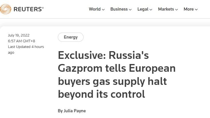 俄羅斯天然氣工業公司(Gazprom)7月14日發送予歐洲客戶的信件表示,俄羅斯基於特殊(extraordinary)情況,無法保證對歐洲客戶供應天然氣,並將啟動「不可抗力」條款。意味著俄羅斯天然氣工業公司或毋需為未能按合約條款供氣承擔責任,加劇歐洲國家的憂慮。