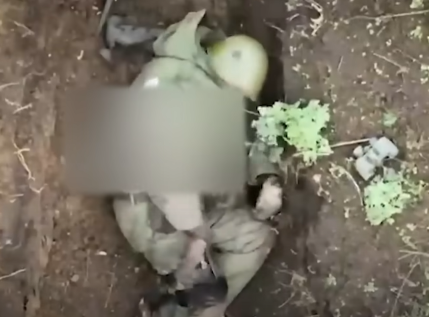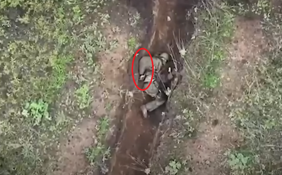 烏軍無人機向側卧於戰壕內的受傷俄軍,投擲榴彈。(互聯網)
