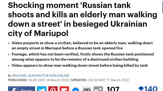 英國《每日郵報》(Daily Mail)報道,一段由烏克蘭亞速營軍方釋出的影片顯示,俄軍一輛坦克正在馬里烏波爾在建築物殘骸中,另一邊見有一名男子在路的另一旁行過,片段中那男子並沒有掩藏或作出任何特別舉動,未幾卻遭俄坦克發射火箭炮轟炸,火光煙硝頓然揚起。據烏克蘭亞速營軍方指,遇害者是一名老人,手無寸鐵。報道提到有關視頻未經獨立核實。