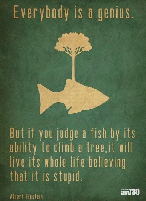 「每個人都是天才。但若你以爬樹能力來論斷一條魚,牠終此一生將自視為笨蛋。」(Everyone is a genius. But if you judge a fish by its ability to climb a tree, it will live its whole life believing that it is stupid.)這句發人深省「愛因斯坦名句」,無日無之地在網上出現。《美國今日報》(USA Today)指,上月Facebook又有一幅配以此「名句」的繪圖瘋傳,輕易獲得逾10萬個like,但此金句並非出自愛因斯坦之口。
