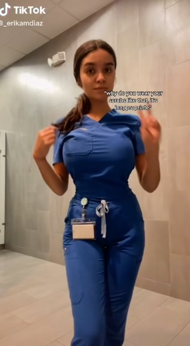 22歲女護士Erika Diaz早前在TikTok分享她穿起制服的「申冤短片」,埋怨有人問她「為甚麼你要把制服穿成這樣,這並不恰當」。她展示制服生產商的廣告,指廣告中亦可見制服本身就是貼身、收腰及束腳設計,並非她故意想穿到「爆衫」,「有些人是對我的身材有意見,而不是制服……我5呎2吋高、107磅,既矮又細小,你們喜歡的話可以說我身材造假,但這不是事實。」