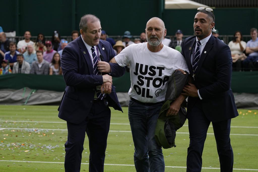環保分子大鬧溫布頓網賽,「機場式」安檢淪笑話。(美聯社)