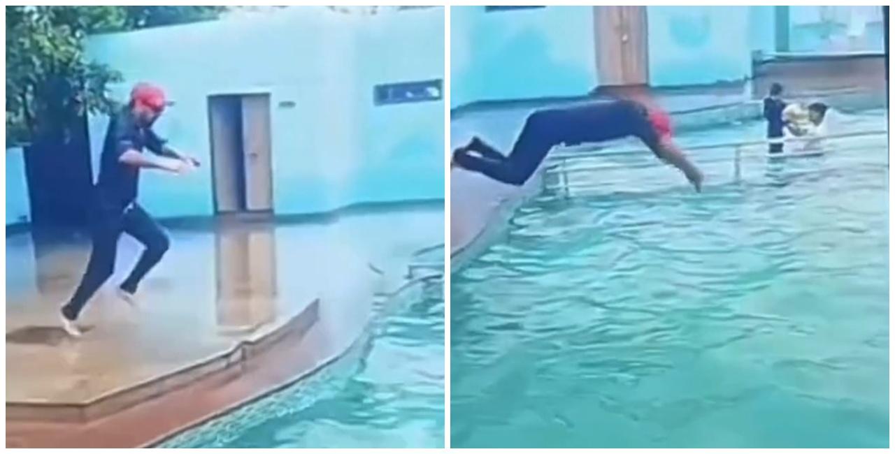 #राजस्थान के कोटा में एक फार्म हाउस के स्विमिंग पूल में स्टंट करते एक युवक की मौत हो गई. सीसीटीवी में देख सकते हो कि चंद सेकंड में उसकी जान चली गई. युवक का नाम मुबारिक था. pic.twitter.com/KbLNSqvJAg