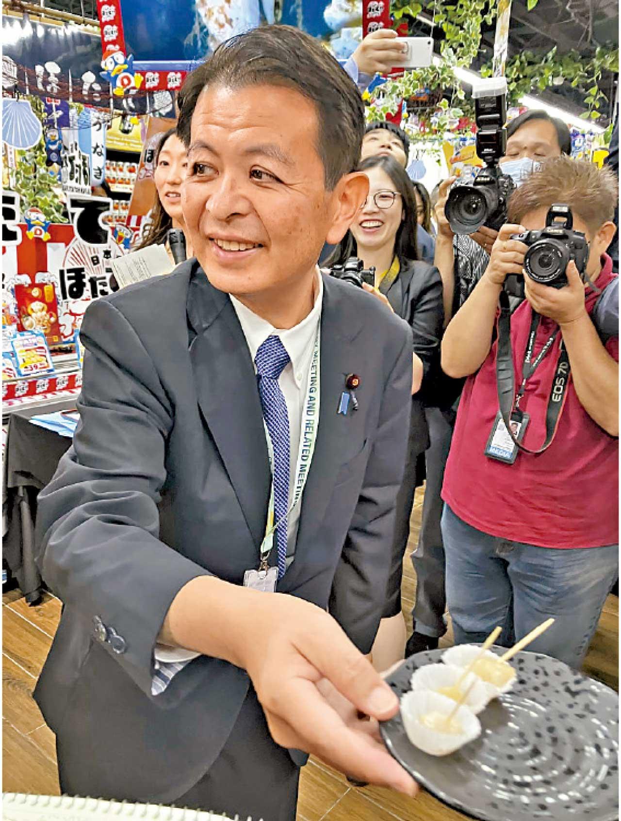 農林水產大臣宮下一郎到馬來西亞推廣日本水產,派扇貝給在場人士試食。(美聯社)