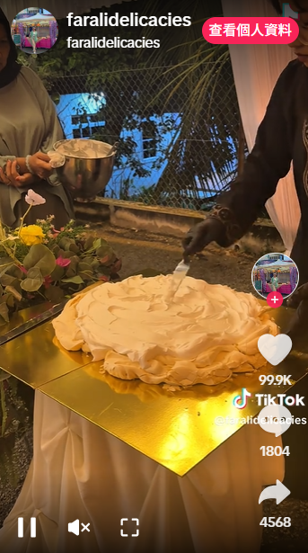 蛋糕師@faralidelicacies在TikTok發片,展示當日在一場婚禮上,即席在20吋的意大利帕芙洛娃蛋白霜蛋糕上,加上忌廉、藍莓及士多啤李,以呈現意式鄉村風味。